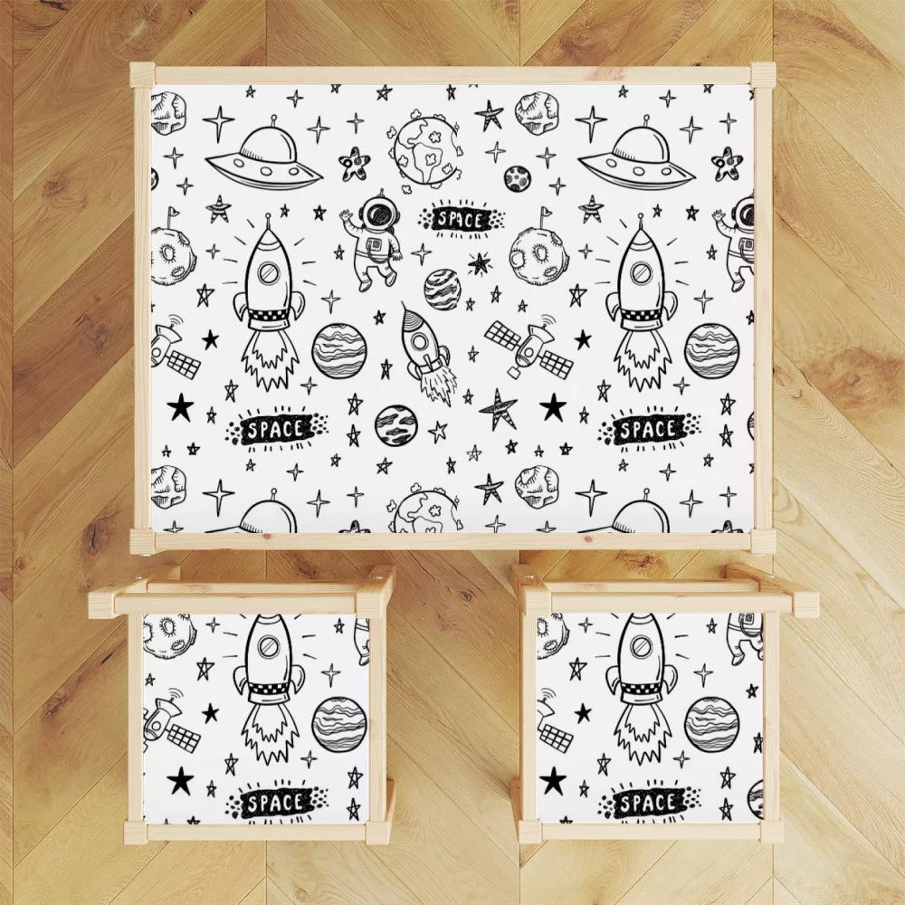 Varázsold egyedivé gyermeked IKEA LATT asztalát és a hozzá tartozó székeket, ezzel a expedíció az űrbe nevű stílusos bútormatrica szettel! Ezek a speciális matricák amellett, hogy dekorálnak, játékfelületként is funkcionálhatnak. Szuper könnyen felvihetőek és kizárólag környezetbarát anyagokból készülnek.