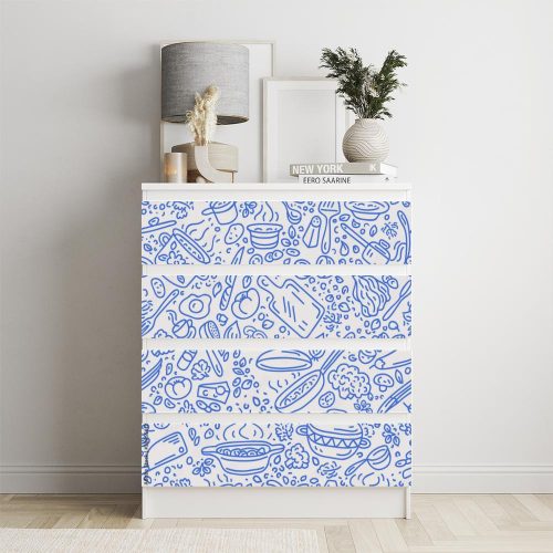 Az IKEA MALM konyhai tárgyak kék kontúrjai bútorfólia/bútormatrica remek megoldást kínál az otthoni bútorok egyediségének fokozására. Bútormatricáink számos lenyűgöző mintával elérhetők. A matrica könnyen felhelyezhető és védő laminátum réteggel van ellátva, amely megvédi a felületét a karcolásoktól és a napfény káros hatásaitól. A matrica változatos méretben kapható, így könnyen illeszkedik az IKEA Malm bútorok különböző típusaihoz. Egyedi jellegével és tartósságával hosszú éveken át az otthon dísze lesz.